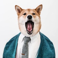 The image features a dog with a human-like pose. The dog, which appears to be of the Shiba Inu breed, is wearing a dark suit with