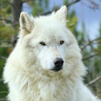 a solitary wolf, with no other wolves or animals visible in the picture. The wolf is looking directly at the camera, giving it a calm and alert expression. There are