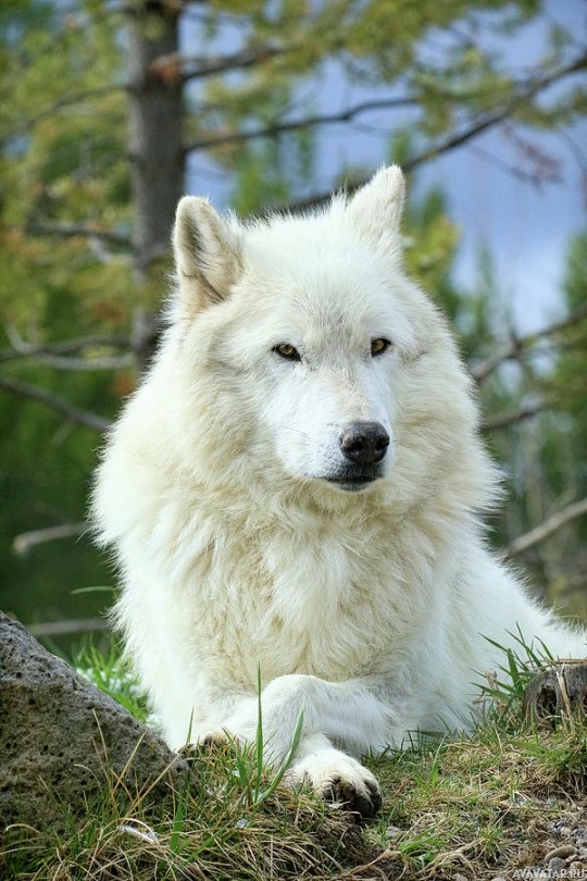 The image shows a wolf sitting on grass. It appears to be