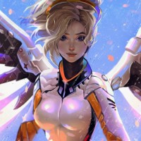 a support hero within the game. She is depicted with her wings spread out and ready for combat or to heal her teammates. Her attire consists of a white and purple suit, which has a futuristic and high-tech appearance, reflecting the overall aesthetic of "Overwatch."