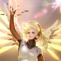 The image shows a character that appears to be Mercy from the game Overwatch. She is depicted with her wings spread, and there are sparkles or magical particles surrounding her, suggesting some sort of magical ability at play. This character is known for her healing abilities in the game.
