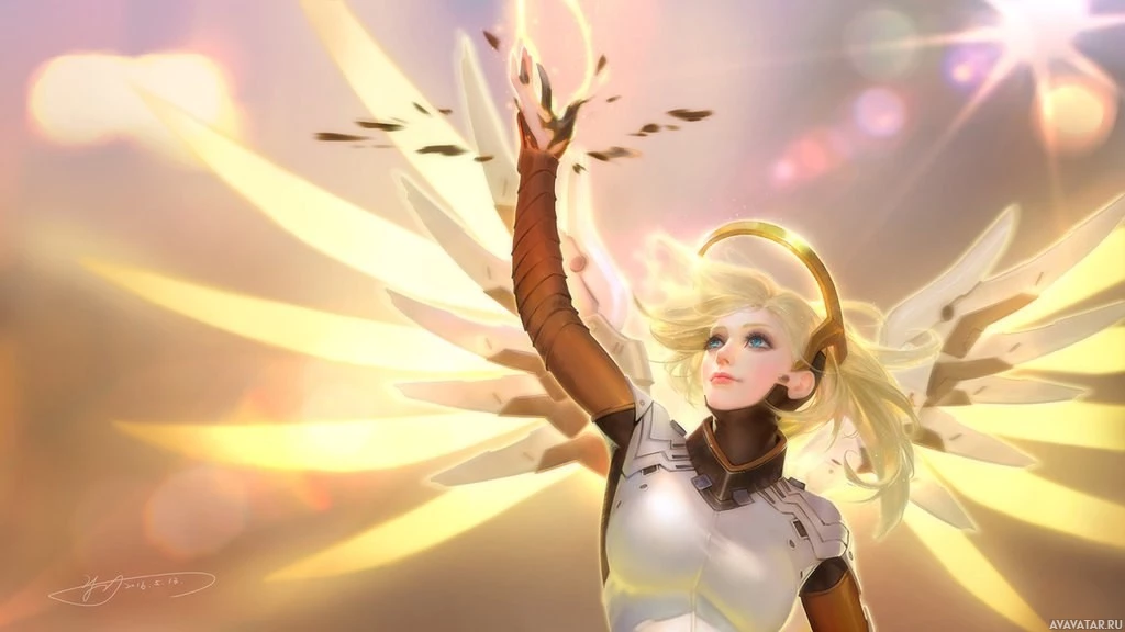 На картинке изображен персонаж, который выглядит как Мерси из игры Overwatch. Она изображена с раздвинутыми крыльями, и вокруг нее есть сверчки или магические частицы, предполагающие какую-то магическую способность в игре. Этот персонаж известен своими лечебными способностями в игре.
