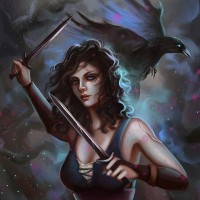 a black crow flying, and the background has a mystical, magical feel with swirling colors and what looks like starry darkness around her. The style of the image suggests it could be related to