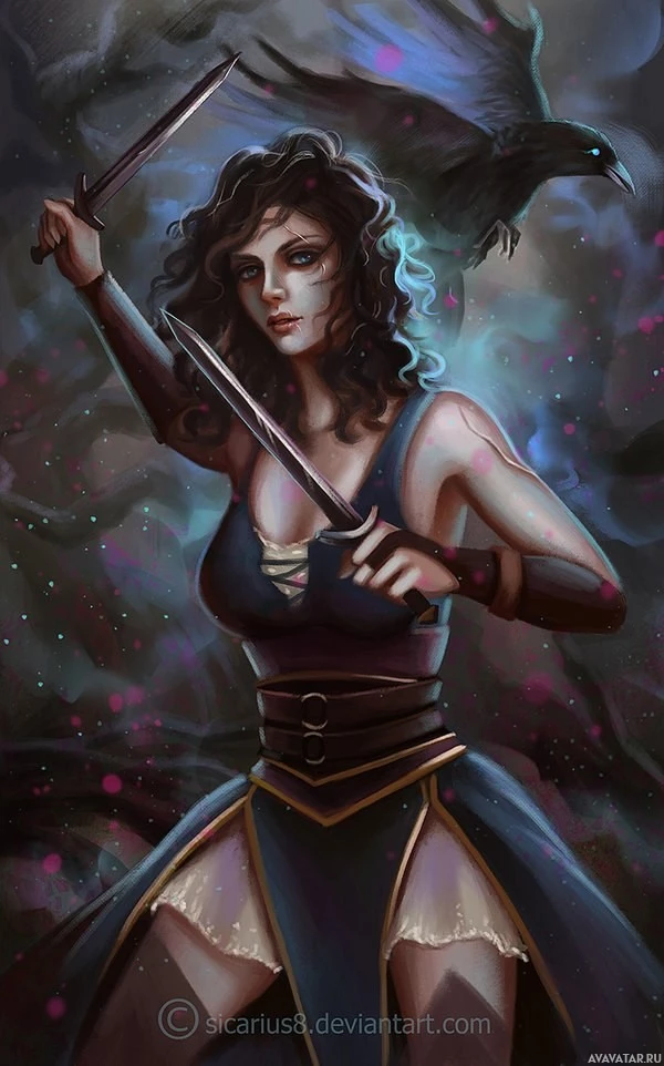 a female character with dark hair, dressed in what appears to be an elven or fantasy-themed outfit. She is holding a pair of knives crossed over her body, ready for combat. Behind her, there is