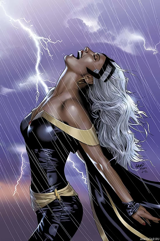 white hair and a costume that includes black and gold elements, which are characteristic of her powerset as a mutant in the Marvel Comics universe. The character appears to be in