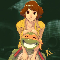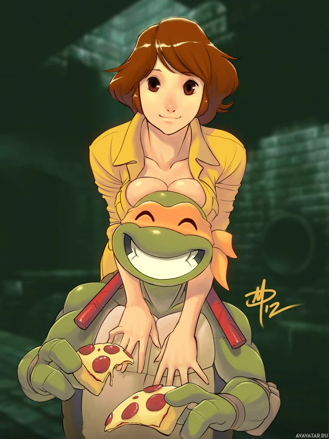 Ninja Turtles (TMNT). She is sitting on top of Michelangelo, who is one of the turtles. Michelangelo has