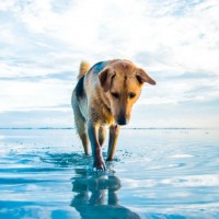 The image shows a dog walking towards a body of water at what appears to be sunrise or sunset, given the soft lighting. The dog is looking down at its reflection in the calm water. This scene captures a serene and peaceful moment that could evoke feelings of tranquility and companionship.