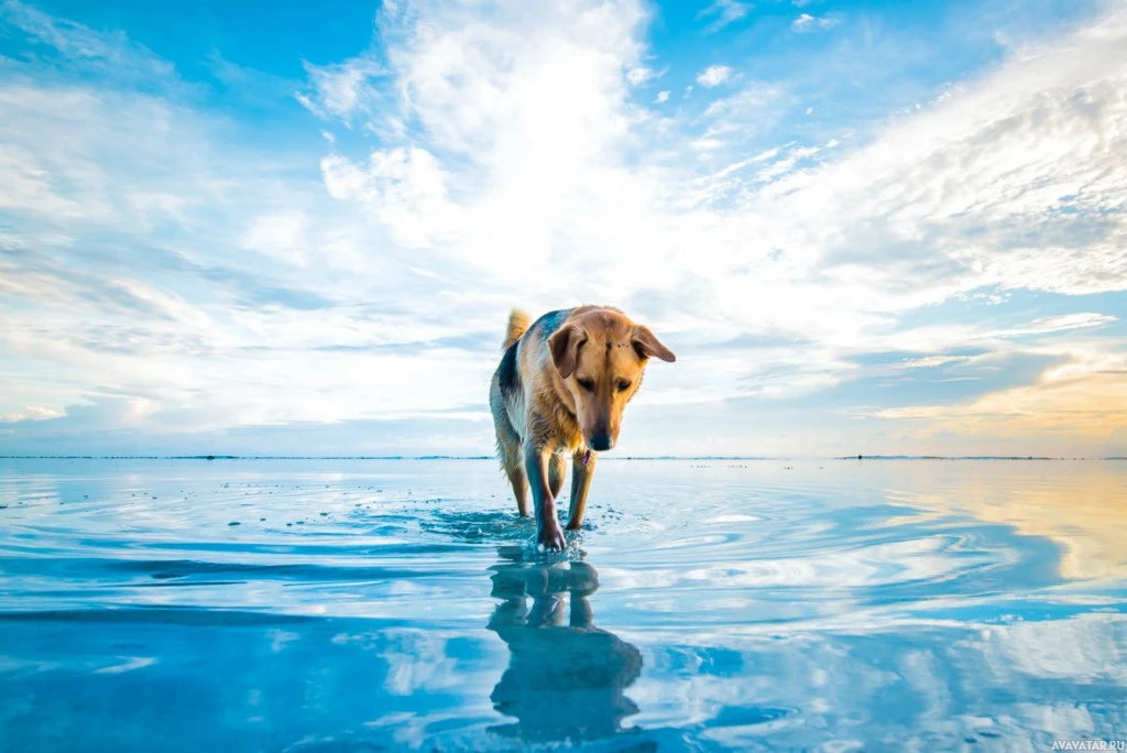 На картинке изображена собака, идущая к водоему на рассвете или закате, учитывая мягкое освещение. Собака смотрит вниз на свое отражение в спокойной воде. Эта сцена захватывает спокойный и спокойный момент, который может вызвать чувство спокойствия и общения.