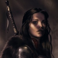 brown hair, portrayed as a warrior or heroine. She is wearing armor and carrying what appears to be a sword in her right hand, suggesting she is a fighter of some sort. Her gaze is directed off-camera, and her expression is serious, indicating that she may be on a mission or preparing for battle. The setting looks like it could be outdoors, possibly during a time when armor was worn regularly in
