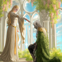 the magical atmosphere of the scene. The overall mood is serene and somewhat solemn.