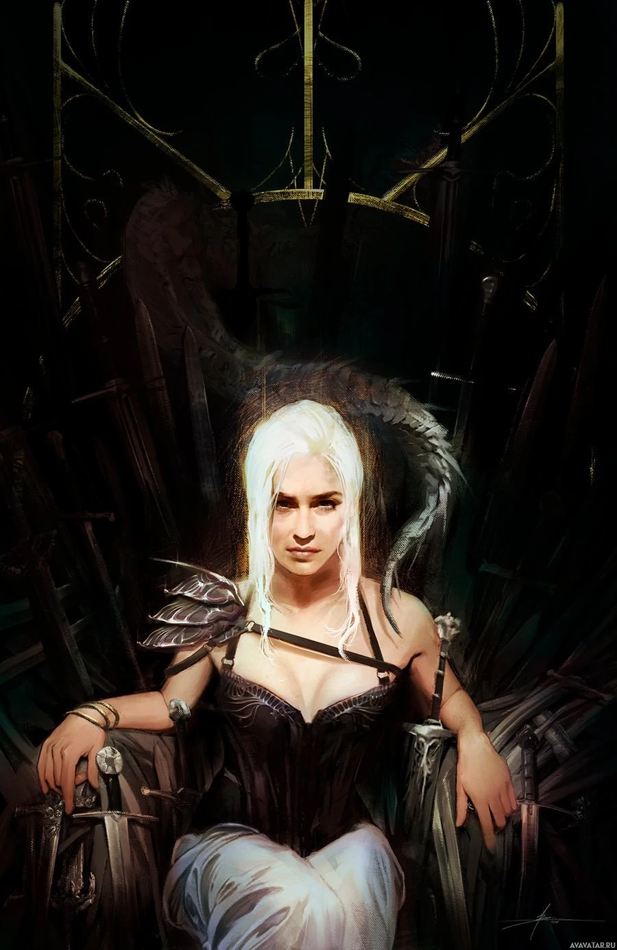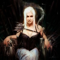 Daenerys Targaryen, and she is portrayed by actress Emilia Clarke. She is seated on a throne with her hands resting on it, and the setting appears to be dark and ominous, fitting the thematic