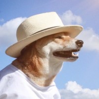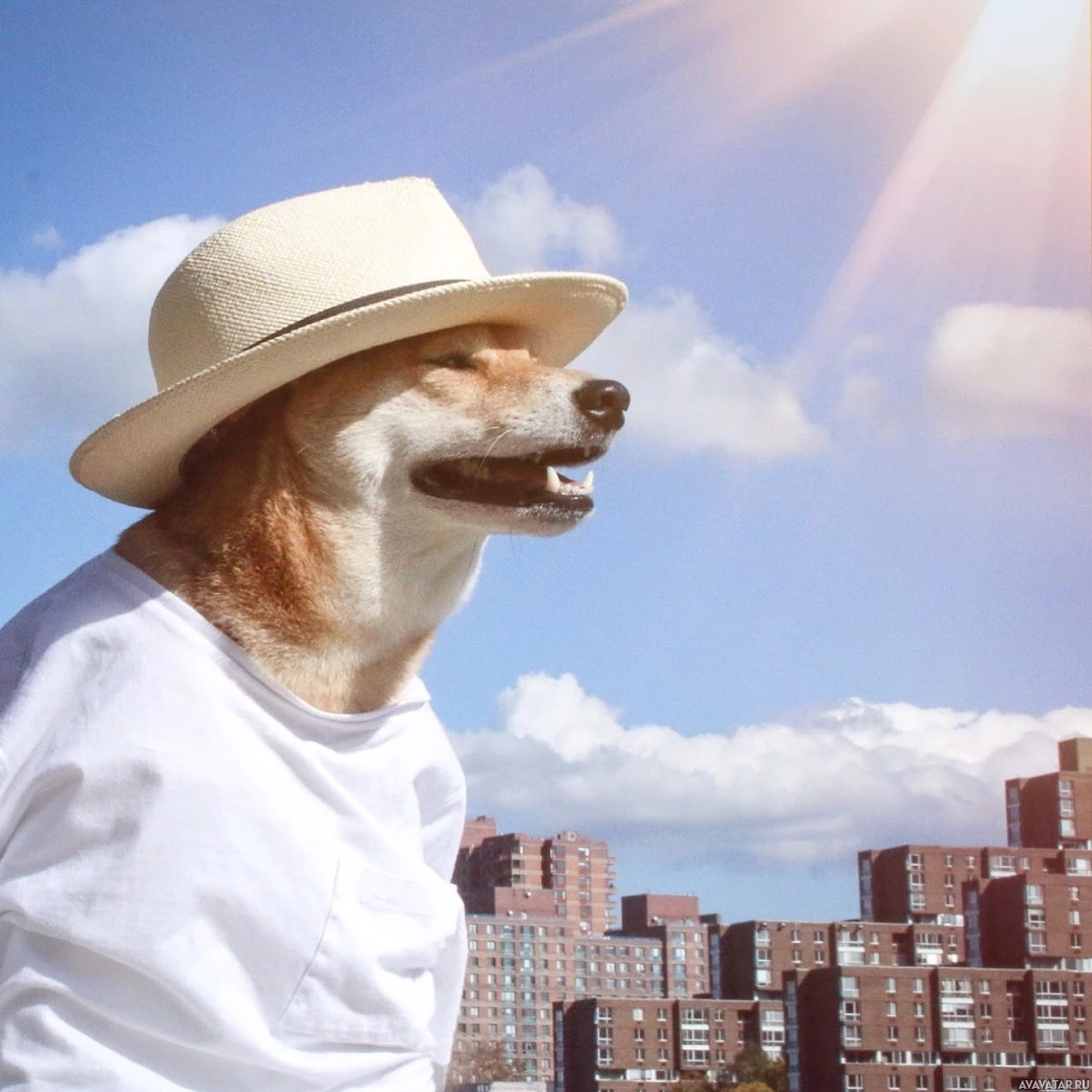 a white hat and sunglasses, along with a white T-shirt. The dog is looking up towards the sky, where there appears to be
