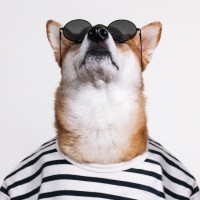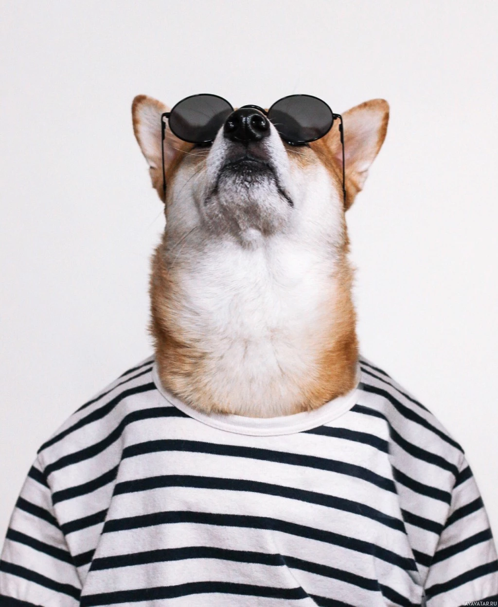 На картинке изображена собака Корги в солнечных очках и одетая в полосатую рубашку. Собака смотрит вверх, создавая впечатление любопытства или внимательности.