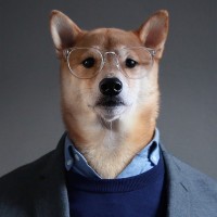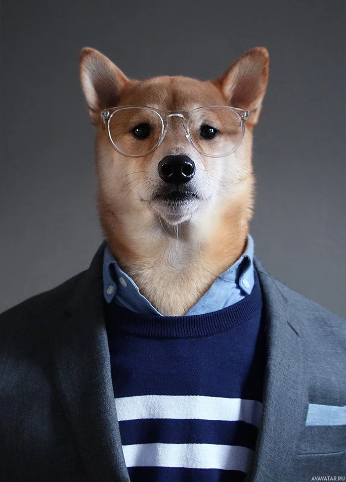 human clothing, specifically a business suit with glasses and a striped sweater. The dog appears to be styled in a fashion similar to how humans might dress for