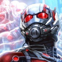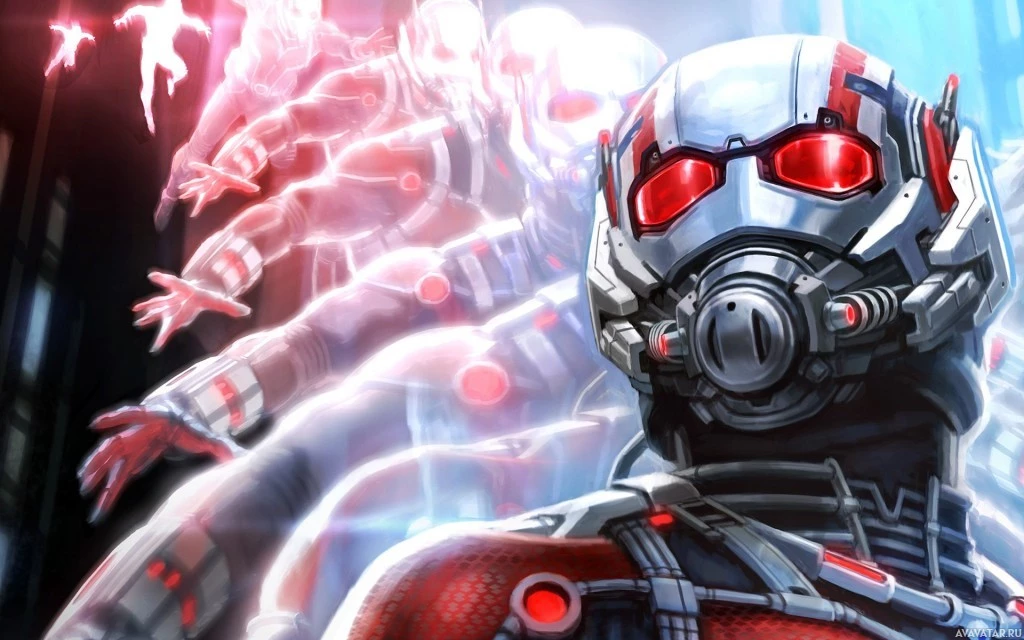 iconic suit with a helmet and goggles that allow him to shrink and expand his size at will, thanks to his unique suit technology. The background suggests a futuristic or science