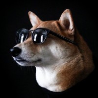 The image features a Shiba Inu dog wearing sunglasses and a black shirt. It's posed with a human-like posture, which suggests that the photo is meant to be humorous or creative rather than realistic.