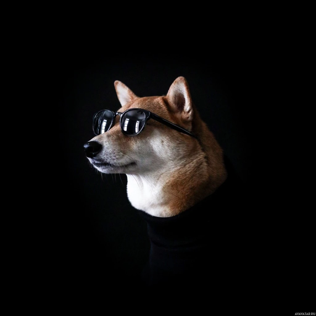 На картинке изображена собака Шиба Ину в солнцезащитных очках и черной рубашке. Он позируется с человекоподобной осанкой, что говорит о том, что фотография должна быть юмористической или творческой, а не реалистичной.