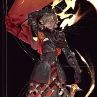 pointed ears, typical of elves in fantasy lore, and the character has a confident expression on their face. In the background, there's a stylized representation of flames, possibly indicating that the character is associated with fire or magic. The artwork also includes text at the bottom which appears to be related to the character or the series they are from.