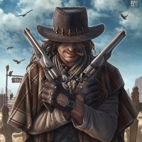 a cowboy hat and two guns. He is smirking or sneering at the viewer, giving off a confident and tough demeanor. His attire suggests he could be a character from a Western movie or video game. The background depicts
