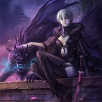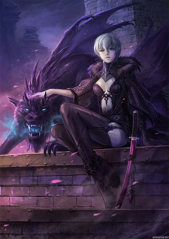 a large dragon-like creature that seems calm. They are both set against a dark backdrop with purple hues and elements such as a castle in the background, which adds to