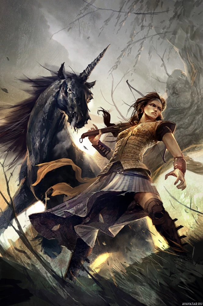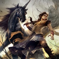a fantasy scene featuring a girl riding on the back of a unicorn. She is dressed in an armor that suggests she may be a warrior or a guardian, with weapons at her side and a determined expression on her face. The setting appears to be a natural, forested area, which adds to