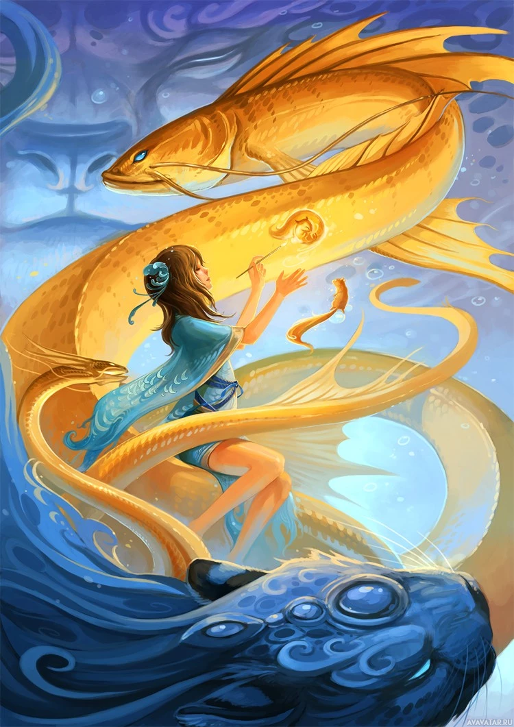 long hair, dressed in what appears to be traditional Asian clothing, sitting on the body of a large, serpentine fish. She is holding onto the fish's tail and seems to be enjoying