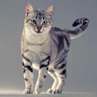 The image features a tabby cat with striking blue eyes. It appears to be standing on an indoor surface, possibly a table or floor, against a neutral background that highlights the animal. The cat's expression seems curious and alert.