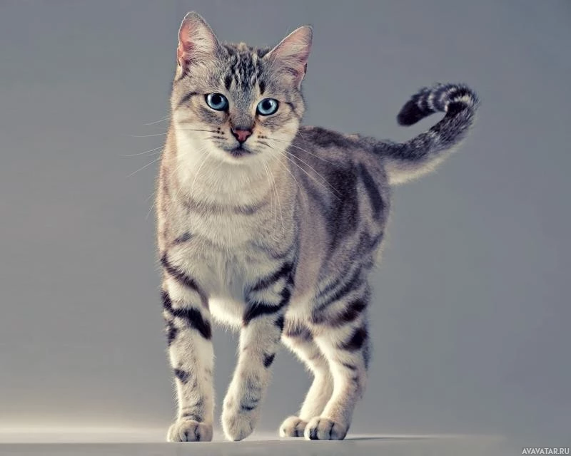 На снимке изображен кот с яркими голубыми глазами. Похоже, что он стоит на внутренней поверхности, возможно, на столе или полу, на нейтральном фоне, который выделяет животное. Выражение кошки кажется любопытным и настороженным.