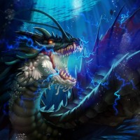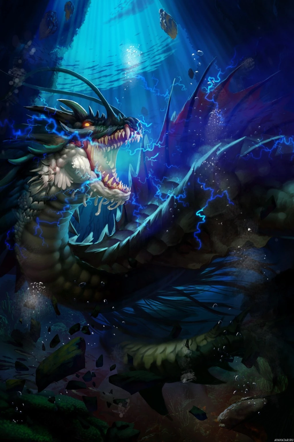 sharp teeth visible and is surrounded by an underwater environment, complete with bubbles and seaweed. The overall atmosphere of the picture conveys a sense of fantasy and majesty, as one might expect from such