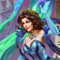 long hair and is wearing regal clothing with a crown, suggesting she holds a position of power or importance within her realm. A blue