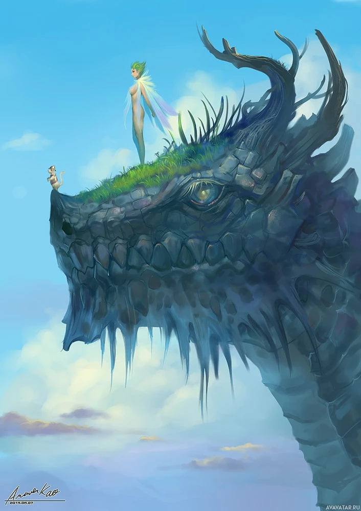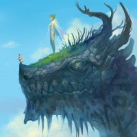 a fantasy scene with a large dragon on the left side and a fairy or sprite on the right. The background is blue with clouds, suggesting