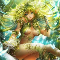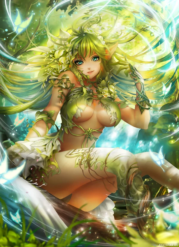 lush greenery and a forest-like environment, which complements her fantastical appearance.