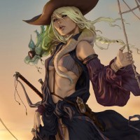 a green dragon-like creature in her left hand, suggesting she might have a mystical element to her character.