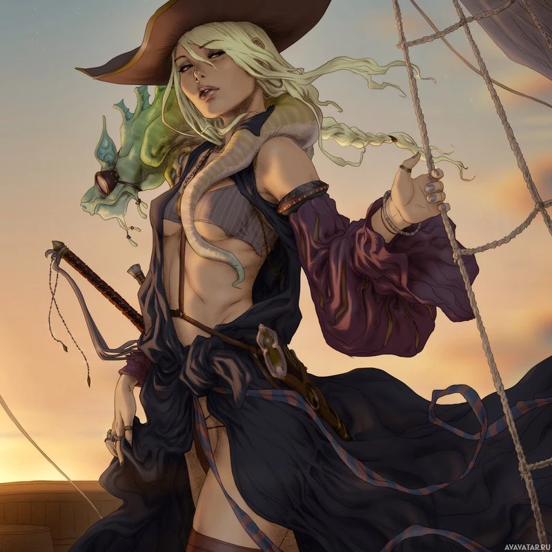 blonde hair and is wearing a hat, which seems to be part of her outfit. The setting looks like it could be on a ship during sunset or sunrise, as indicated by