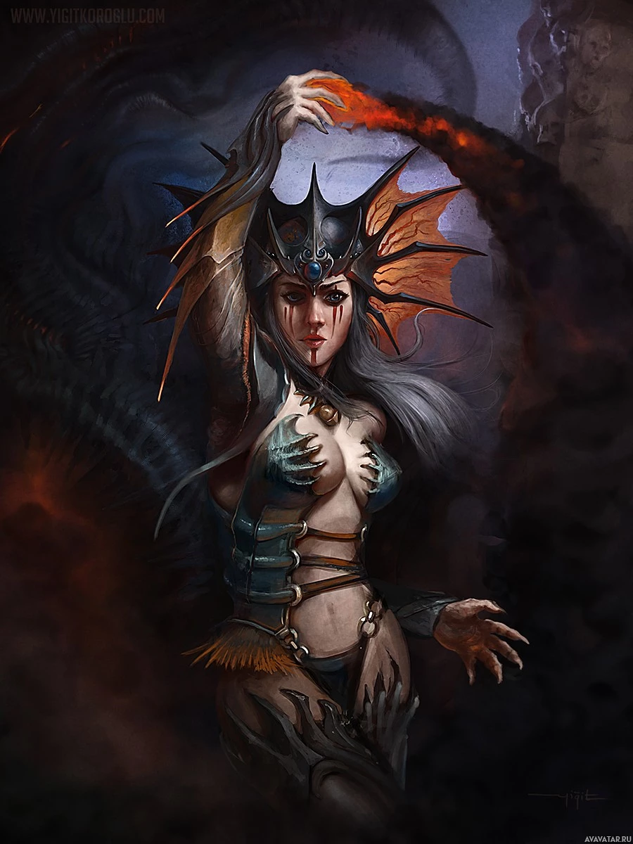 a female character with elements that suggest she is portrayed as both human and creature. She has long