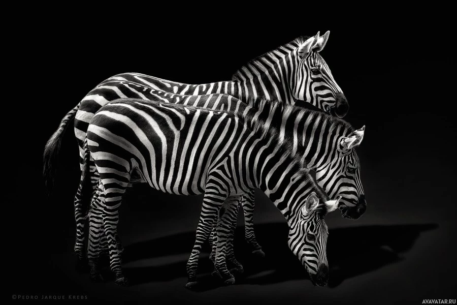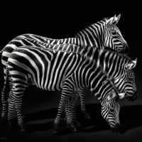 a classic example of a mother zebra and her foal. The background is neutral, which contrasts with the zebras' distinctive black-and-white stripes, making them stand out as