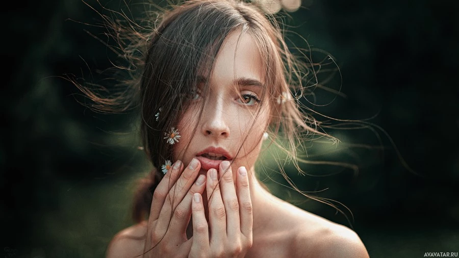 На фотографии изображена молодая женщина. Она, по-видимому, находится на открытом воздухе, о чем свидетельствует естественный свет и размытый фон, который может указывать на листву или открытое пространство. У женщины рука возле рта, возможно, в задумчивой или задумчивой позе. Ее волосы выровнены, и она смотрит прямо в камеру с мягким выражением лица.