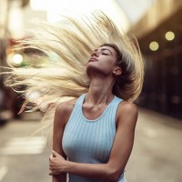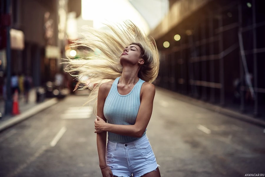 blonde hair, standing on what appears to be an urban street at sunset. She is dressed in casual