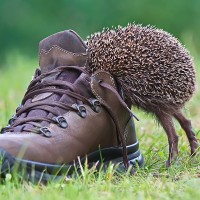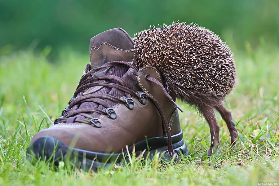 Картинка показывает маленького ежика с задним концом, обращенным к камере, как будто он выходит из пальца коричневого ботинка. Сцена находится на открытом воздухе, вероятно, на траве, которая видна вокруг стопы и ежа. Ежик довольно милый и, кажется, выглядывает из обуви, создавая забавный визуальный образ.