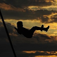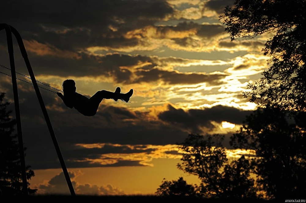 a child swinging on a swing set during what appears to be either sunrise or sunset, given the warm and soft light in the background. The sky is adorned with clouds, adding to