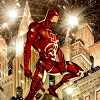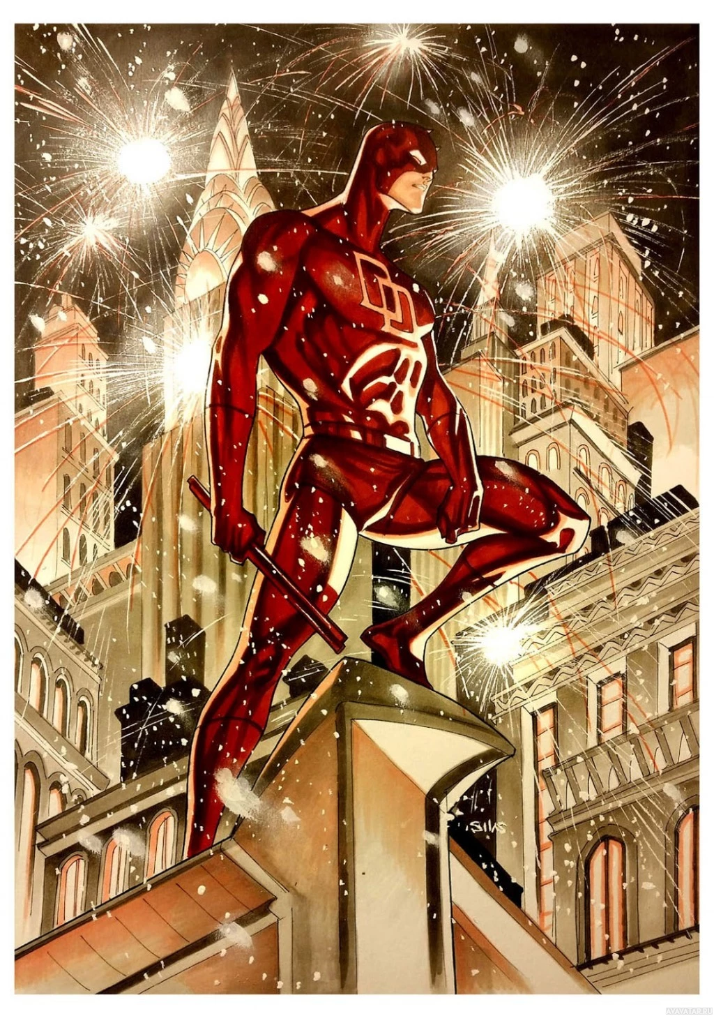 acrobatic skills and heightened senses. He is wearing his signature red and black costume with a bullseye symbol on his chest. In the background, there are fireworks exploding in the sky above a cityscape, suggesting that this may be a celebration or