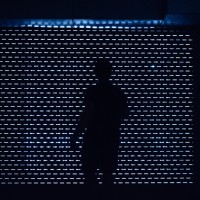 The image shows a silhouette of a person standing in what appears to be a hallway or corridor. There is a patterned surface, possibly tiled, and the lighting is subdued, casting shadows and creating an atmospheric effect.