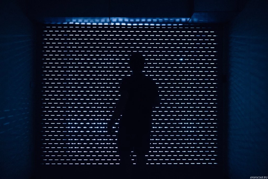 На картинке изображен силуэт человека, стоящего в коридоре или коридоре. Существует узорчатая поверхность, возможно, черепичная, а освещение приглушено, отбрасывая тени и создавая атмосферный эффект.