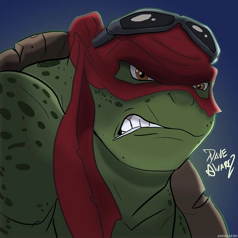 an animated character known as Raphael from the Teenage Mutant Ninja Turtles franchise. He is depicted with a tough and determined expression, wearing his signature