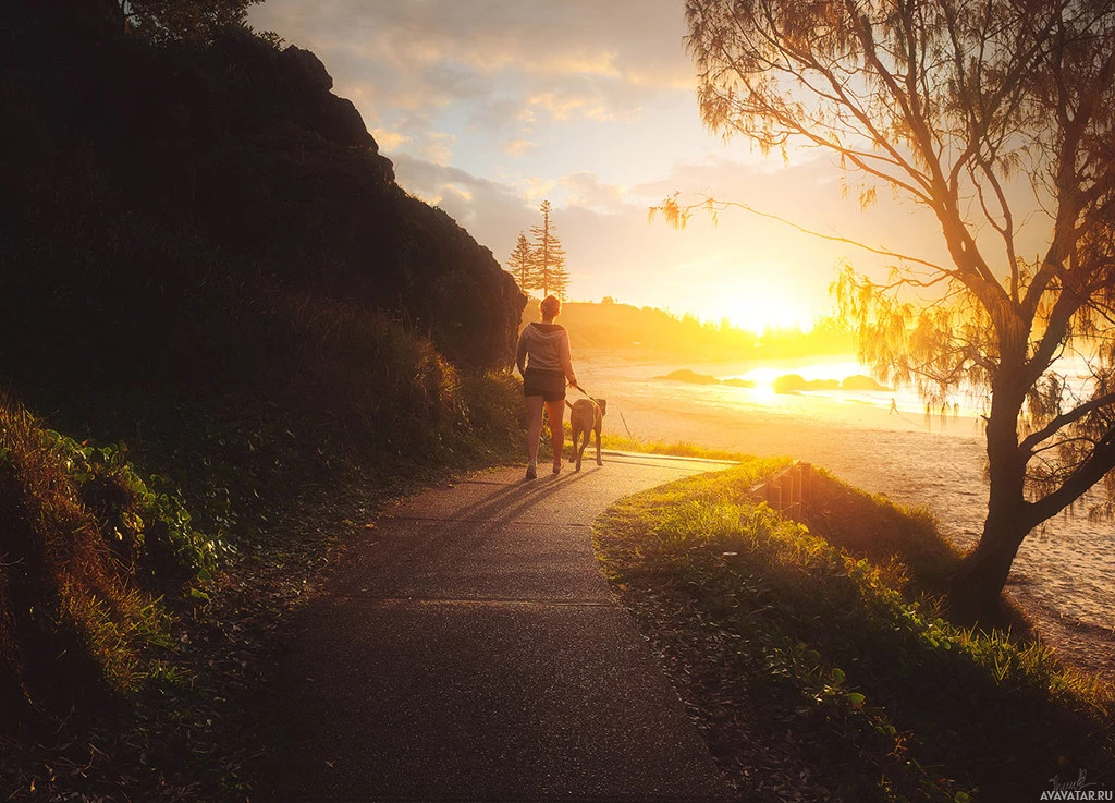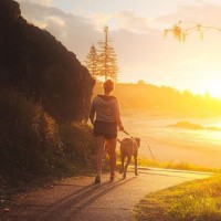 the surrounding scenery, which includes vegetation and a hillside with some trees. A dog can also be seen in the foreground, seemingly accompanying the individual on their walk. The image captures a serene and picturesque moment likely at a beach or