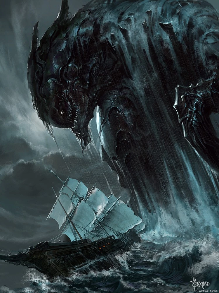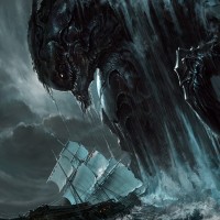 a fantastical scene where a large monster with sharp teeth and scales is emerging from the ocean. It appears to be menacing or attacking, as it raises its tentacles and snarls at a small sailboat that is in