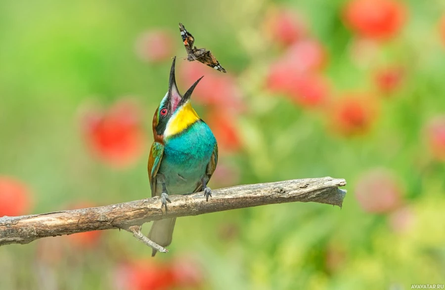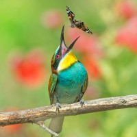 a colorful bird, which appears to be a hummingbird given its small size and hovering position. There is an insect, specifically what looks like a dragonfly, flying near the bird. In the background, there are