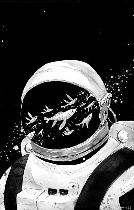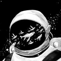 outer space filled with small black and white images that appear to be fish. This creates a surreal or conceptual visual where the astronaut's perspective is merged with what seems to be