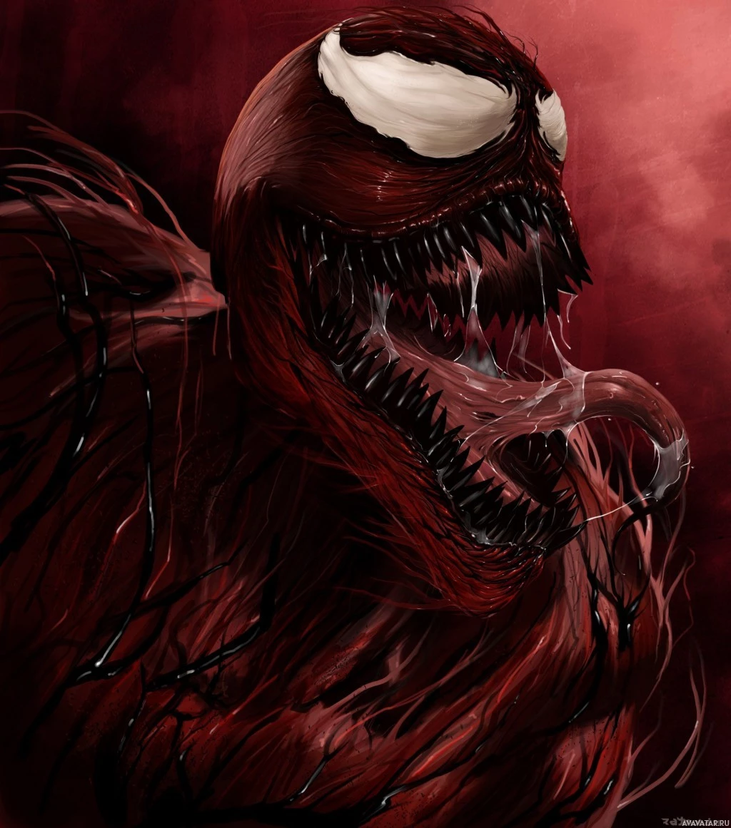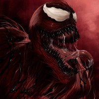 mouth area. The background has a dark red tint with light rays emanating from the bottom right corner, creating