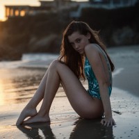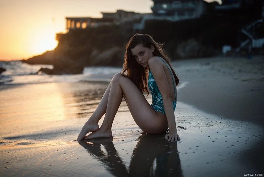 На снимке изображена молодая женщина, сидящая на пляже на закате. Она, кажется, наслаждается своим временем сама, с ее ногами, вытянутыми перед ней, и руками, покоящимися возле ее тела. Заходящее солнце бросает теплый свет на сцену, подчеркивая естественную красоту окружающей среды вокруг нее.